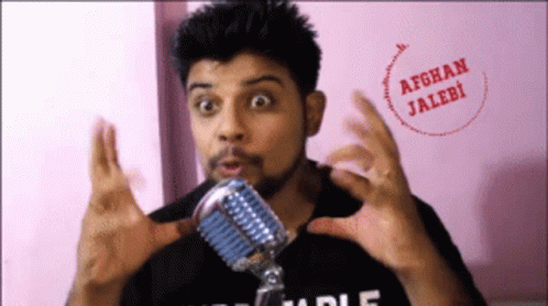 Akash passionately performs a cover of 'Afghan Jalebi' into a vintage microphone, with expressive gestures.