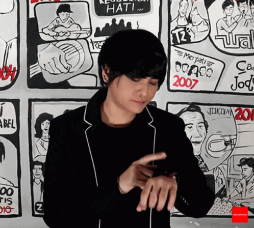 Mita The Virgin checks her watch, looking bored and upset while waiting in front of a cartoon wall.
