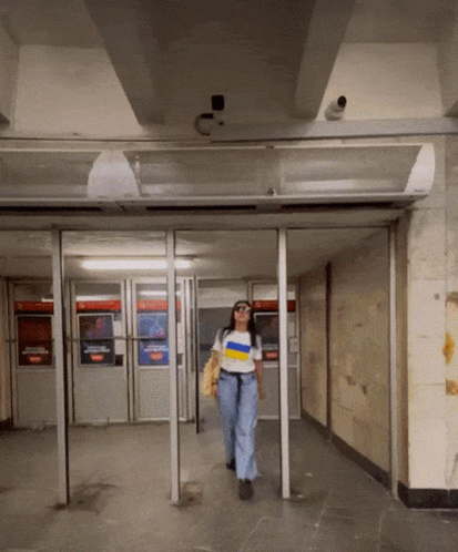 Jamala Dżamala, wearing a Ukrainian flag shirt, walks through a Kyiv Metro station.