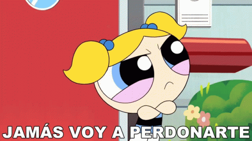Bubbles from The Powerpuff Girls, looking angry and declaring "I'm never going to forgive you."