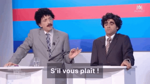 Jamel Debbouze and Gad Elmaleh in a comedic sketch, delivering lines with exaggerated expressions.