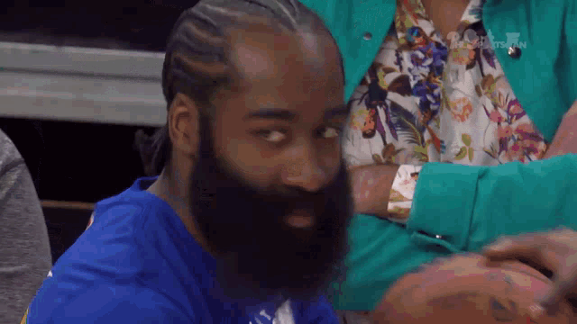 James Harden, wearing a 'Built by Black History' shirt, flexes his biceps courtside with a smile.
