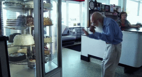James Randi gazes at a rotating cake display in a bakery, making a humorous gesture.
