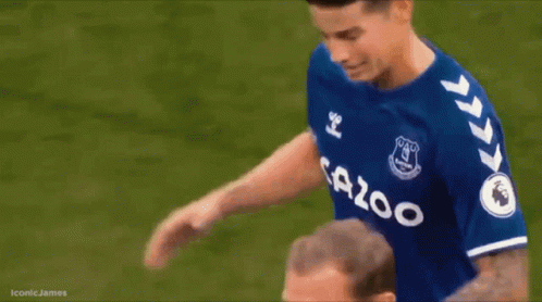 James Rodriguez, wearing an Everton jersey, shakes hands with coach Carlo Ancelotti on the football field.