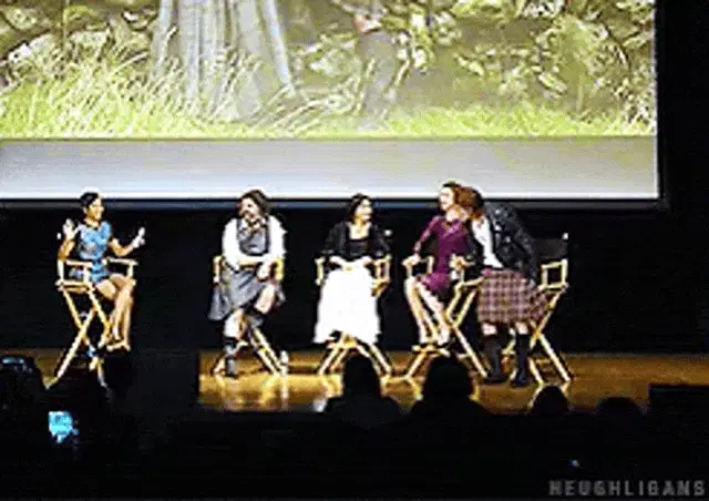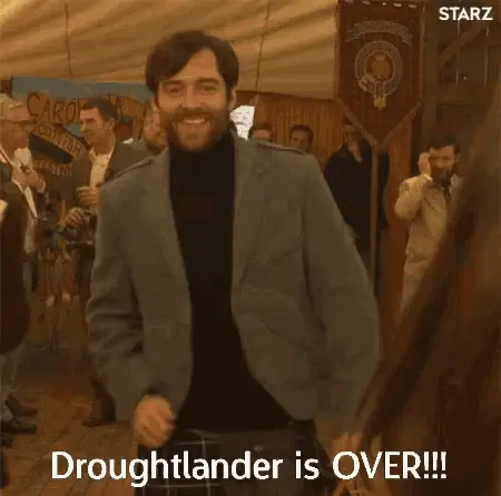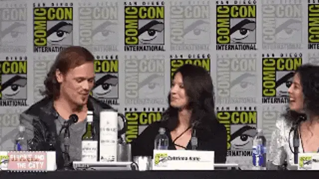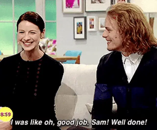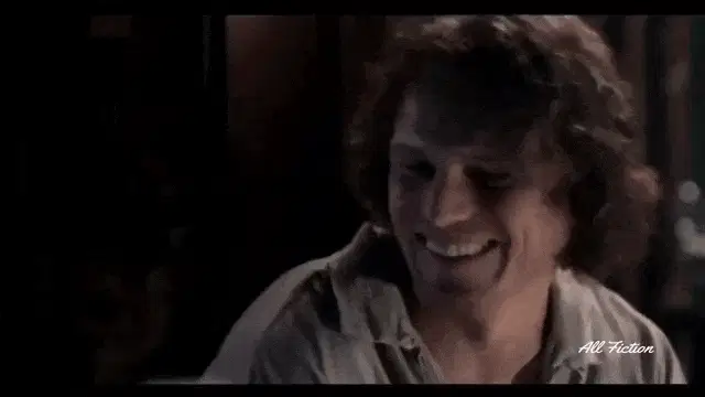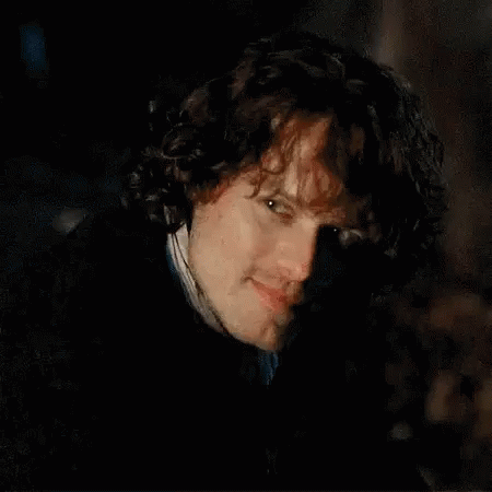 Jamie Fraser looks up with a charming smile in the dark, his curly hair framing his face.
