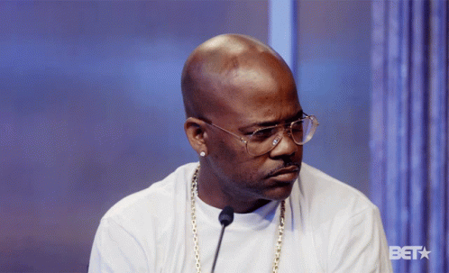 Dame Dash, wearing glasses, stands in front of a microphone with the BET logo visible in the background.