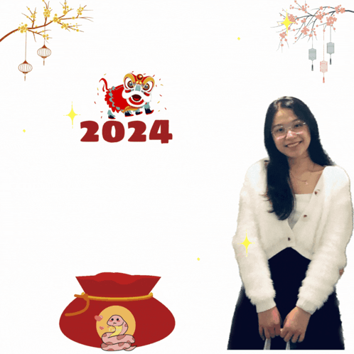 Jane Jane wishes everyone a Happy New Year 2024, with festive graphics, a lion dance, and red envelopes appearing.