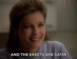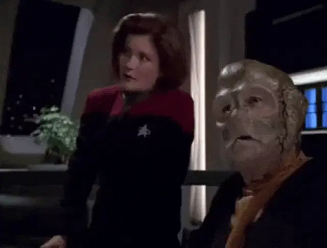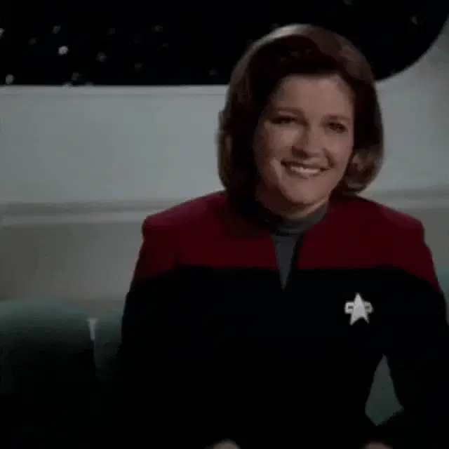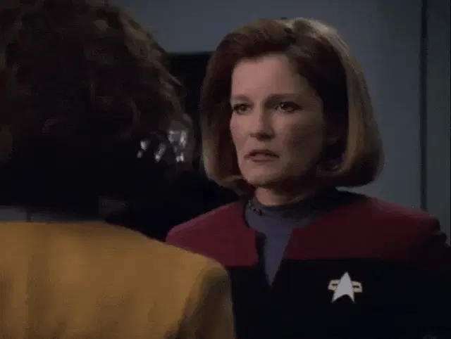 Captain Janeway (Kate Mulgrew) smiles while speaking, with the caption 'AND THE SHEETS ARE SATIN' visible, hinting at a moment with Chakotay.