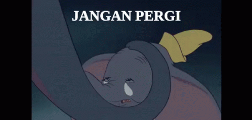 Dumbo crying sadly with the text 'Jangan Pergi' (Don't Go) displayed, expressing a plea.