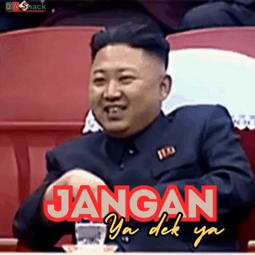 Kim Jong Un waves and smiles with the Indonesian phrase 'Jangan Ya Dek Ya' overlaid, a popular meme from QA Snack.