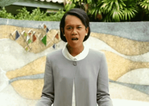Janie, a transgender woman, makes an exaggerated expression, shouting "You idiot!!!" in Thai.