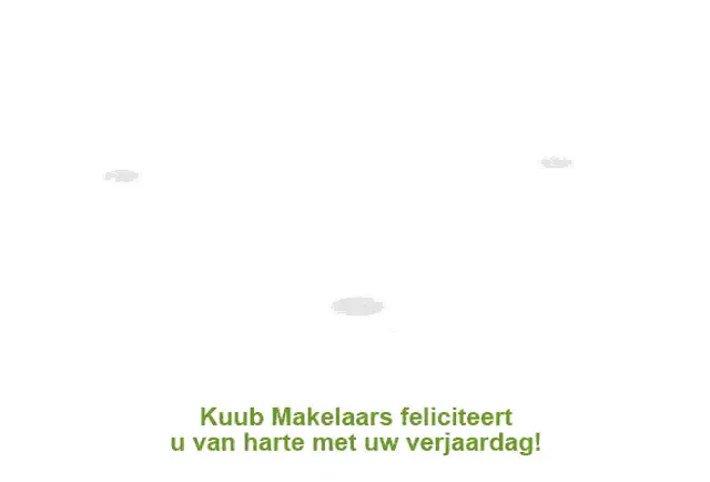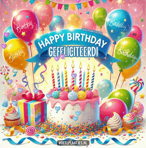 Vibrant birthday greeting with cake, balloons, and 'Happy Birthday Gefeliciteerd!' message.