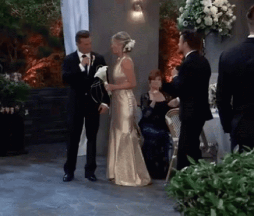 Jason Morgan and Carly (Jarly) at their wedding reception, holding hands and listening to a speech.
