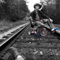 Jarod Kintz on a tricycle on train tracks, wearing a cowboy hat and boots, with smoke from a gun.