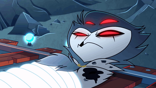 a cartoon character with red eyes is sitting on a wooden platform