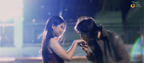 A man tenderly kisses a woman's hand in a romantic, dimly lit outdoor setting.