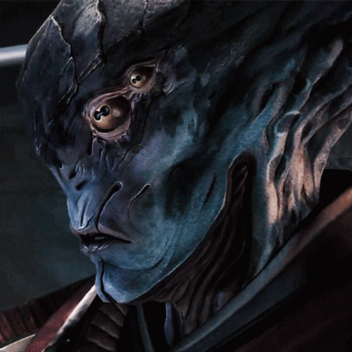 A detailed close-up of Javik, the ancient Prothean from the Mass Effect 3 video game, showcasing his unique features.