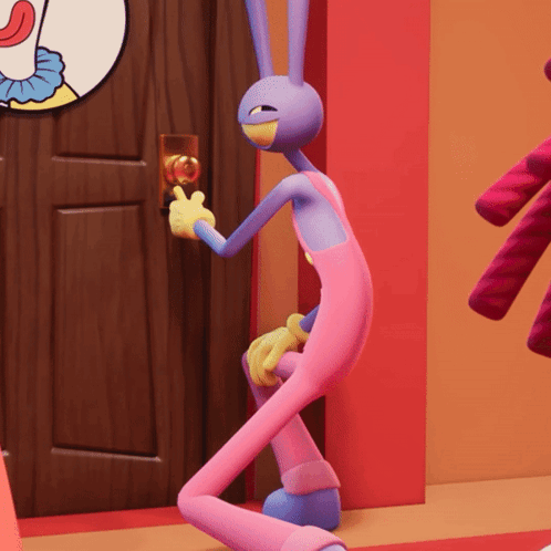Jax, the purple and pink rabbit-like character from The Amazing Digital Circus, stands by a door with a smirk.