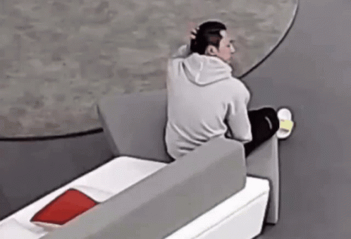 Enhypen's Jay (Park Jongseong) relaxes on a grey couch, shifting from sitting to lying down comfortably.