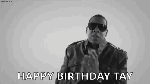 Jay Z, wearing sunglasses and a jacket, wishes 'Happy Birthday Tay' in this black and white clip.