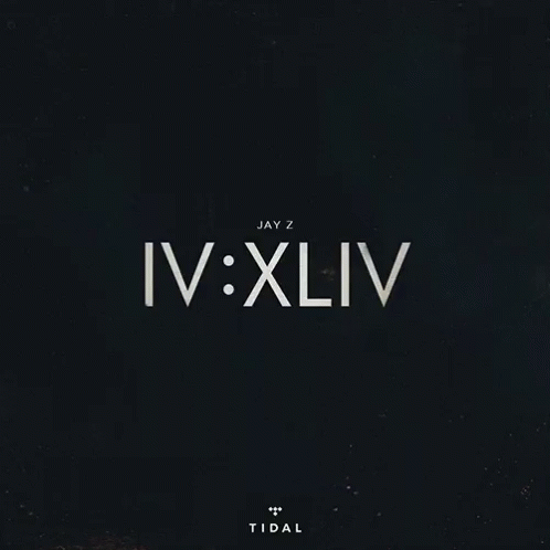 Jay Z's IV:XLIV album cover featuring the artist's name and album title in Roman numerals.