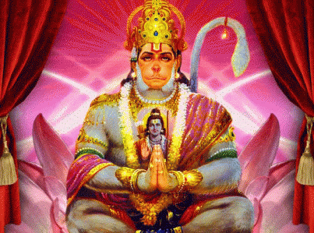 A vibrant painting of Lord Hanuman, the devoted Ram Bhakt, seated on a lotus and holding Lord Rama.