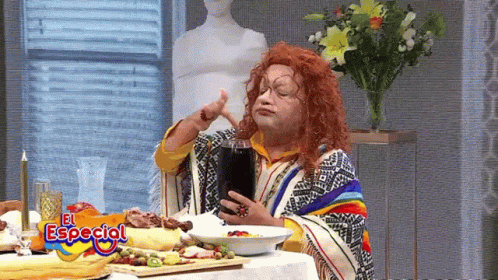 Comedian JB impersonates Eliane Karp on the Peruvian show 'El Especial', drinking from a glass at a festive table.