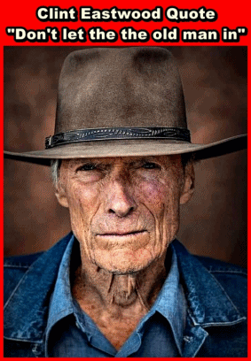 Clint Eastwood in a cowboy hat, featuring the quote 'Don't let the old man in', presented by Jcroat Johncarlduck.