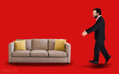 JD Vance, in a suit, walks towards a beige couch with yellow pillows against a bright red background.