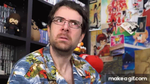 Joueur Du Grenier (JDG) reacts with a surprised expression, wearing glasses and a Hawaiian shirt.