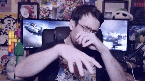 Joueur Du Grenier, Jdg, covering his face in a moment of frustration or 'venting', possibly friendzoned.