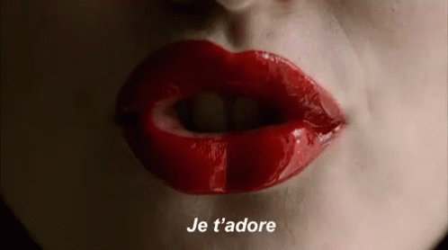 Close-up of a woman's glossy red lips with the French phrase 'Je t'adore' (I adore you) displayed.