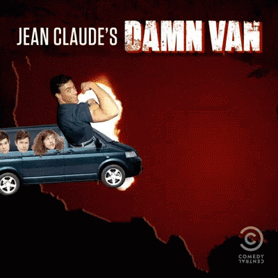 Jean-Claude Van Damme flexes from his 'Damn Van' as it flies over a fiery map of the USA.