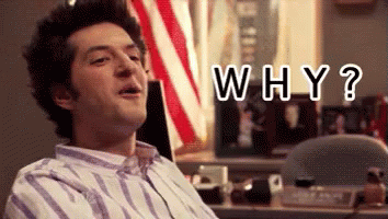 Jean Ralphio from Parks and Recreation repeatedly asks 'Why?' with an expressive face while sitting in a striped shirt.