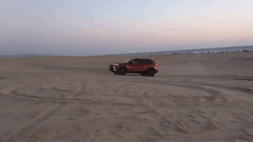 loadingRed Jeep Driving on Beach, Splashing Through Water