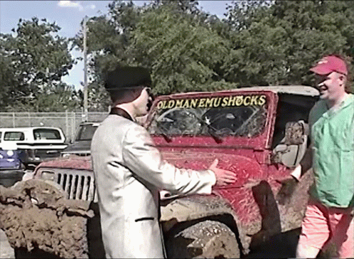 Two men shake hands next to a very muddy red Jeep, which has "OLD MAN EMU SHOCKS" on its windshield.