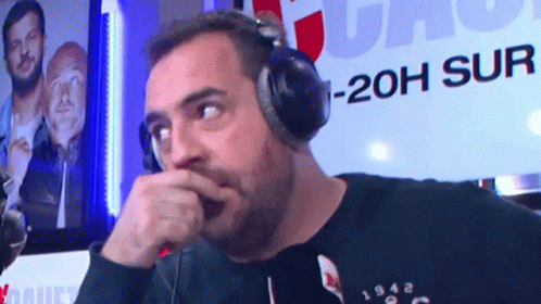 Jeff Cauet, wearing headphones, displays a perplexed smirk while on air at NRJ radio.