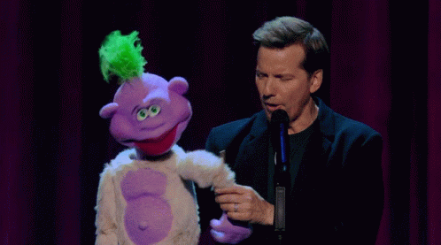 Jeff Dunham performs a stand-up comedy act with his purple puppet, Peanut.