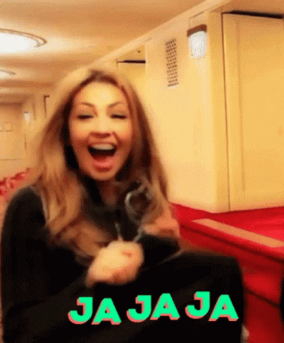 Thalía laughing joyfully in a hallway, with 'JA JA JA' text on screen.