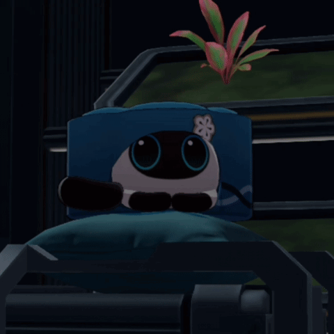 Ruan Mei's adorable Jelly Cat creation from Honkai Star Rail blinks its big eyes while sitting on a cushion.
