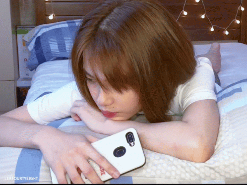 Jem from MNL48 relaxing on a bed, engrossed in her phone.