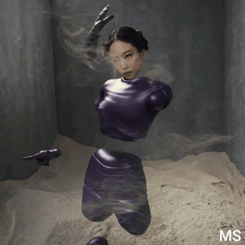 Jennie (Blackpink) and Doechii in a surreal K-pop music video visual, featuring a floating figure in a purple latex suit.