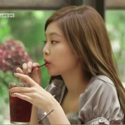 Jennie from BLACKPINK enjoying a refreshing iced coffee with a straw, looking cute and relaxed.