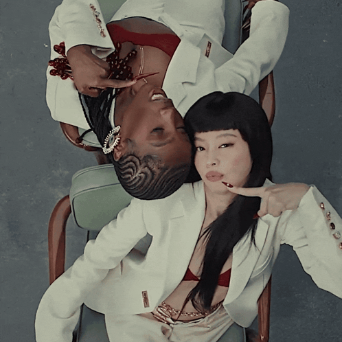 Jennie and Doechii pose together, lying on chairs in a stylish setting for 'Extral Extral'.