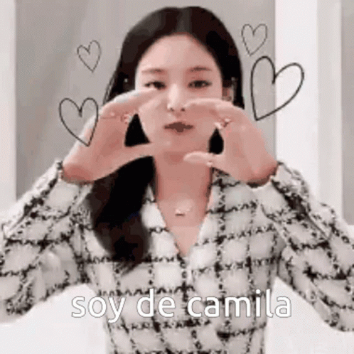 Blackpink's Jennie Kim makes a cute heart gesture with her hands, surrounded by animated hearts, and then smiles brightly.