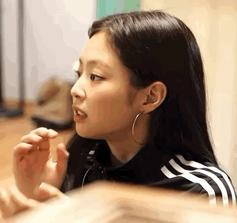 Jennie Kim turning her head, wearing hoop earrings and a black jacket with white stripes.