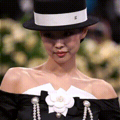 Jennie Kim at the Met Gala, showcasing her elegant Chanel outfit with a black top hat and pearl details.