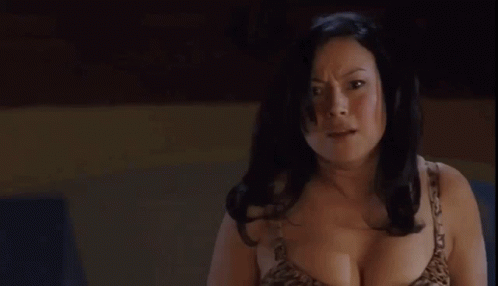 Jennifer Tilly making a dramatic screaming face while wearing a leopard print top in a dimly lit room.