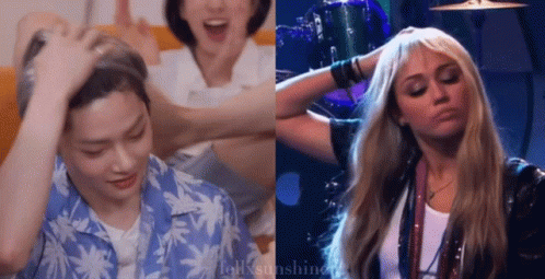 Jeongin from Stray Kids reacting in a meme alongside Hannah Montana (Miley Cyrus) in a split screen.
