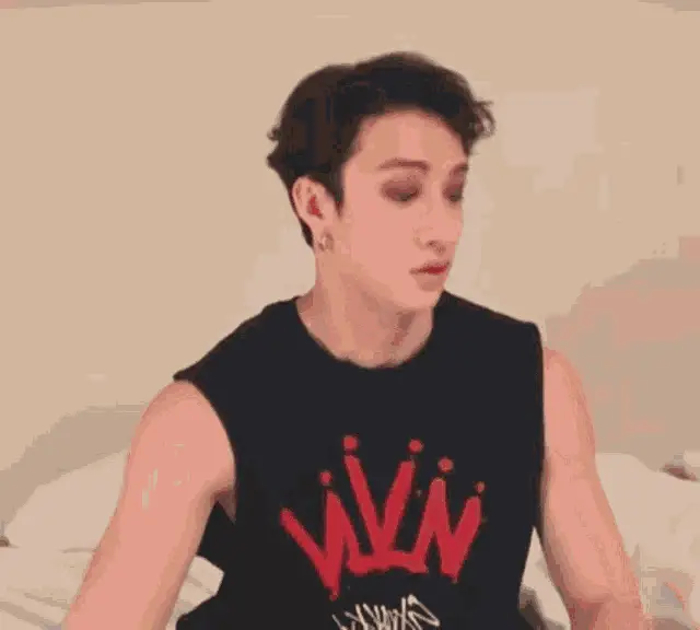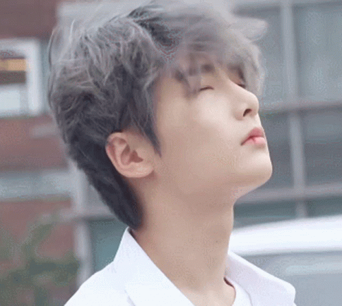 Stray Kids' Jeongin looks up with a serene expression, eyes closed then slowly opening, showcasing his grey hair.